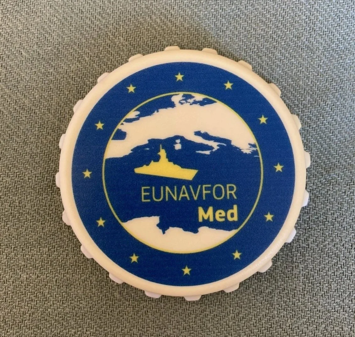 EUNAVFOR MED operation Sophia was an EU counter-migrant smuggling naval force, operating on the south-central Mediterranean Sea (2015-20). It is also the topic of my research. The magnet in the photograph is a gift from a former student. This student, who at the time was already working for the EU in Brussels, had happened on an operation Sophia information and promo-stand and brought this magnet back for me. I like how this magnet is just so perfectly random. Why does an EU military operation hand out a (fridge?) magnet and (beer?) bottle opener as promotional material?